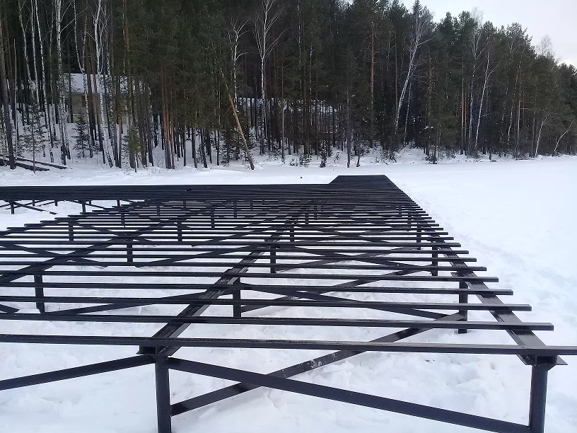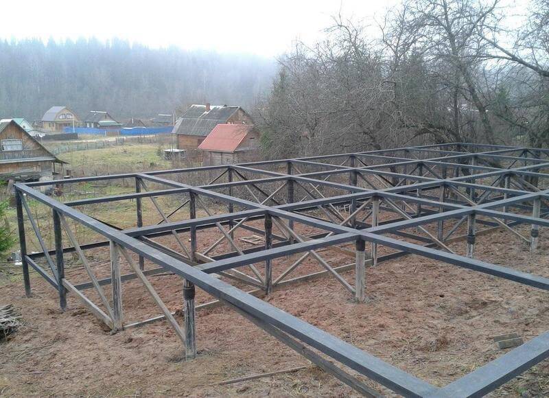 - Припущенный. Рама наваривается под оголовками, соединяя все опоры между собой в целый каркас. Здание монтируется непосредственно на оголовки. Применяется при большой высоте подъема свай над уровнем земли с целью упрочнения конструкции и повышения стойкости столбов к деформации. Для создания контура применяют трубу круглого или квадратного сечения.
