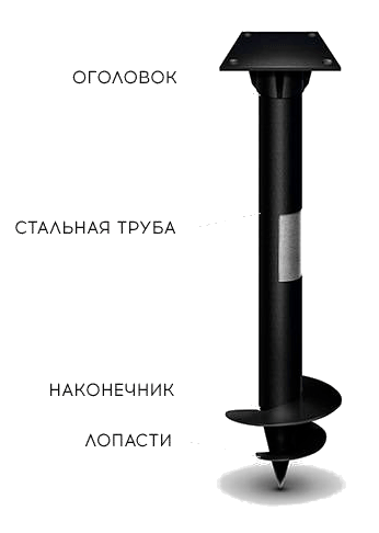 Конструктивно винтовые сваи под фундамент представляют собой толстостенные стальные трубы, которые в основании оборудованы винтом-резьбой для ввинчивания в грунт. При вкручивании в почву спиральные лопасти уплотняют ее и способствуют прочной фиксации опорной сваи в ней.